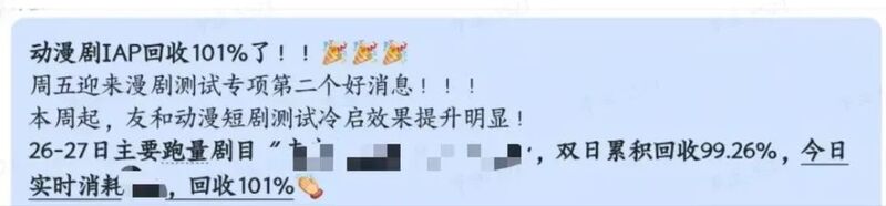 2024年12月底,友和文化宣布制作的漫剧成功回本,IAP回收101%。相关人员曾向“wuhu动画人空间”表示,最初测试的一个多月里,投流花费6万,只回了1000元,测试了快20部就1部成功了,“可能和短剧一样有测出率。”