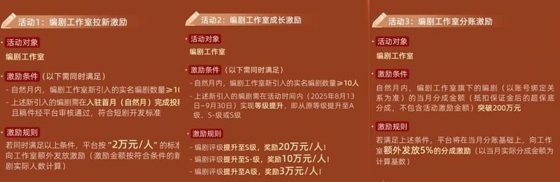 其次,红果针对编剧工作室发布了拉新激励、成长激励、分账激励三项政策,工作室每月引入并投稿过稿的新编剧达10名可获2万/人的奖励;工作室编剧在自然月内实现等级晋升可获奖励;工作室编剧当月分成总金额超200万元,工作室可得额外5%分成激励。此外,还有一项针对个体编剧的剧本拉新专项激励。
