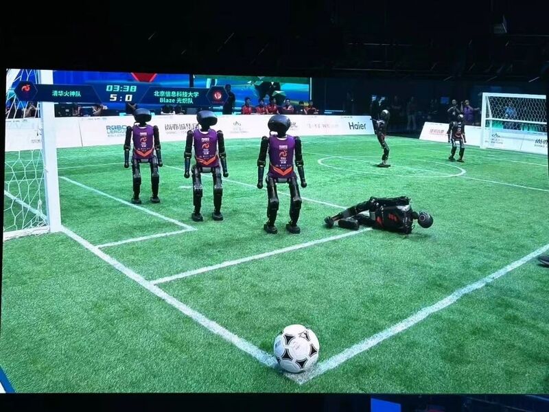 T1机器人摔倒后可以自己爬起来,这个过程只需两三秒时间。不过也有机器人摔倒后出现故障,这就需要工作人员用担架将其抬下场做进一步检查。