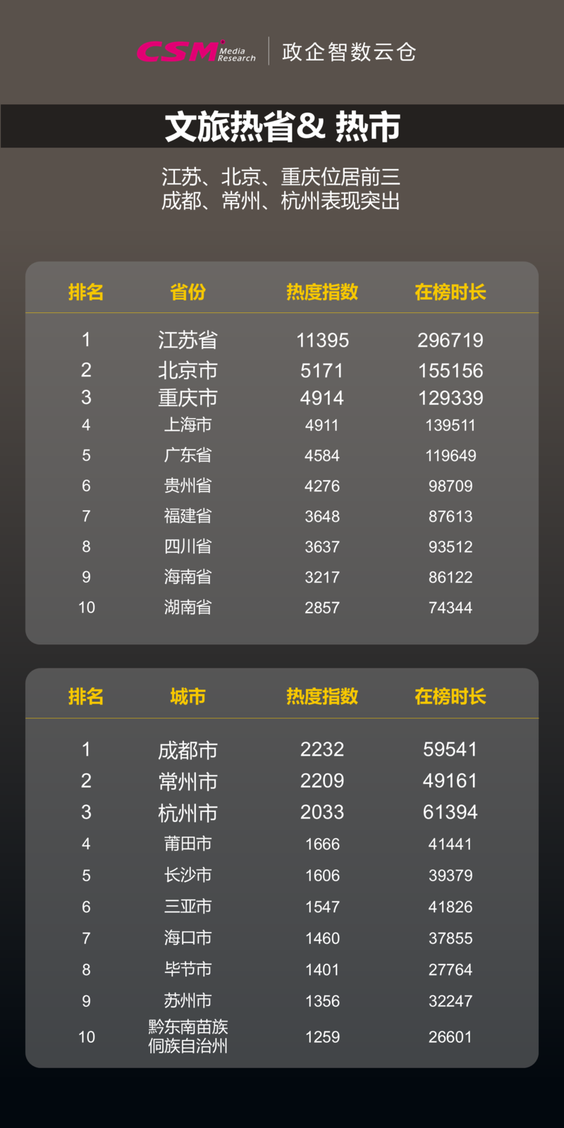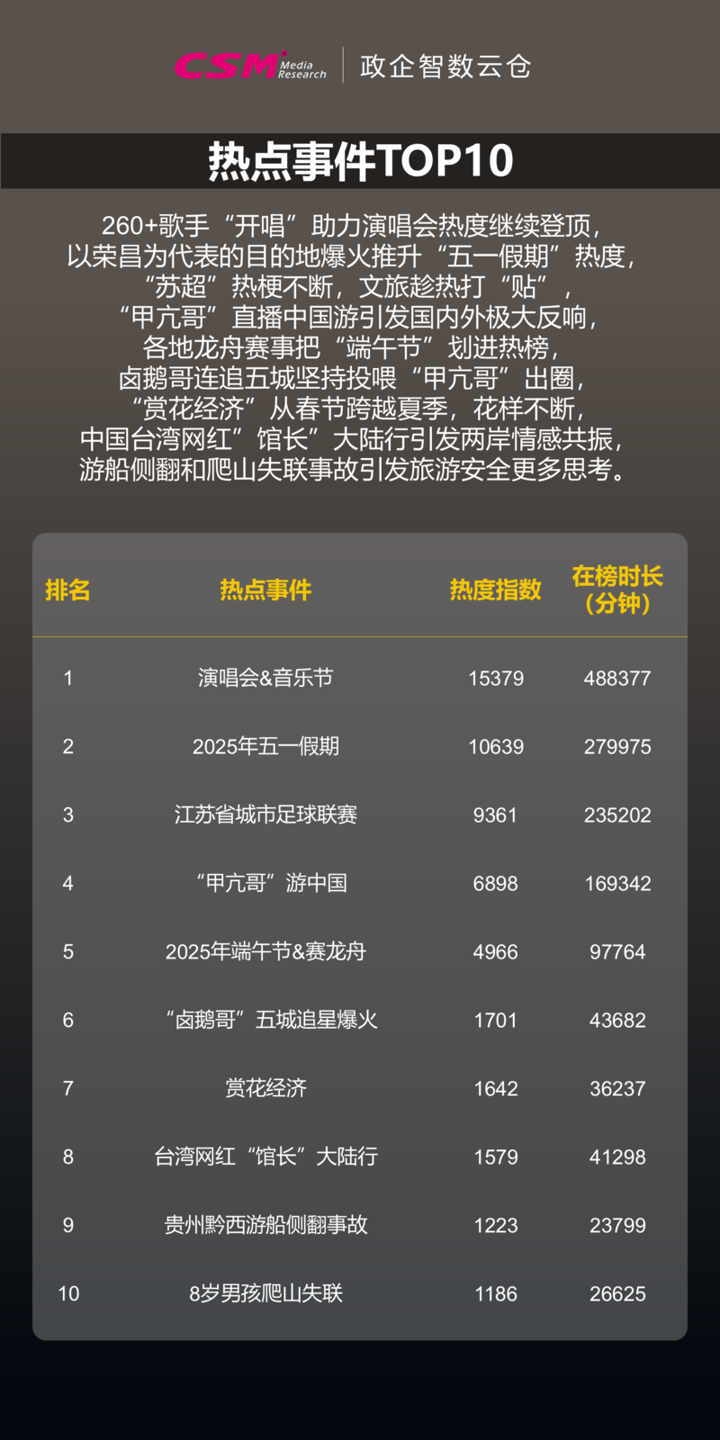 2025年第二季度,文旅市场热度空前迸发。“苏超”点燃全民狂欢、龙舟赛事焕活非遗基因、草根力量带火美食地标,共同印证了文体旅深度融合、文化IP赋能、草根力量崛起的澎湃动力。本文基于CSM政企智数云仓2025年第二季度的文旅热度数据,探寻文旅市场火爆背后的变化与创新。