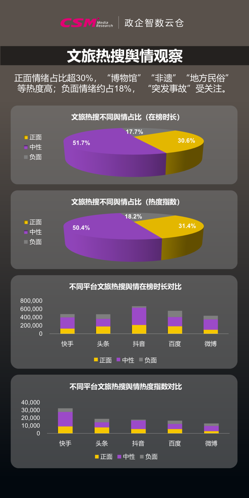 相关热搜中,正面舆情的在榜时长和热度指数占比超过30%,负面舆情的在榜时长和热度指数约为18%。“博物馆”“非遗”“地方民俗”等正面相关舆情热点,凸显了传统文化通过活态场景重塑旅游体验并驱动区域经济发展的价值。“游船侧翻事故”“男孩爬山失联”“鼓楼瓦片脱落”等突发事件也警示行业亟需进一步加强预防与应急机制,为文旅消费筑牢安全底线。