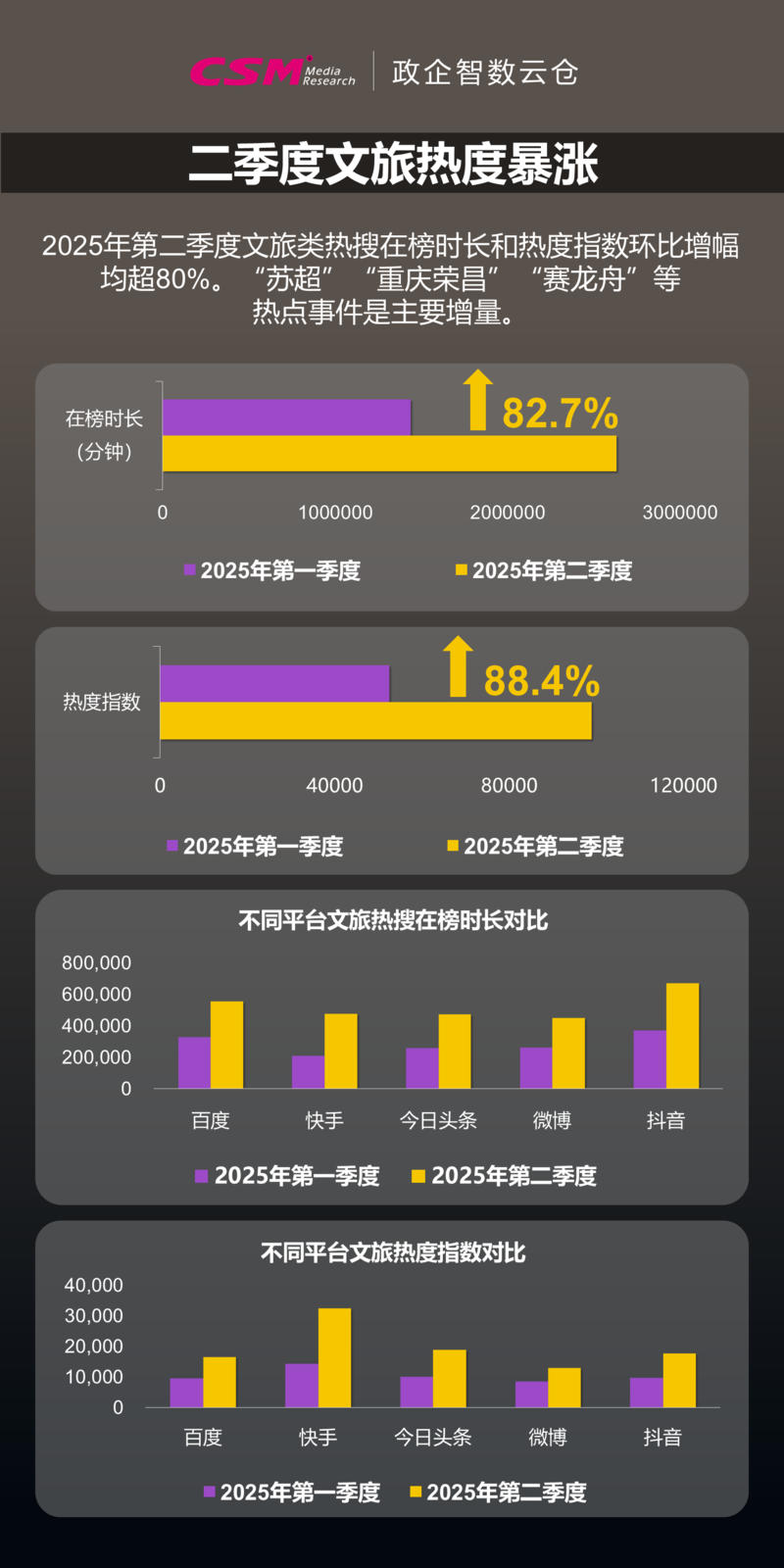 CSM政企智数云仓文旅数据显示,在“苏超”“重庆荣昌”“赛龙舟”等热点事件推动下,2025年第二季度文旅热度暴涨。文旅相关热搜在榜时长环比激增82.7%,跨平台热度指数环比激增88.4%。五个监测平台均呈现显著涨幅,其中快手热度数据翻番,增幅达到126.5%。
