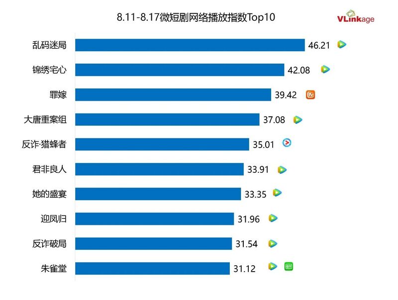 下图为上周微短剧网播指数Top10,有两部作品网播指数40+,分别为新剧《乱码迷局》和上线第二周的《锦绣宅心》。