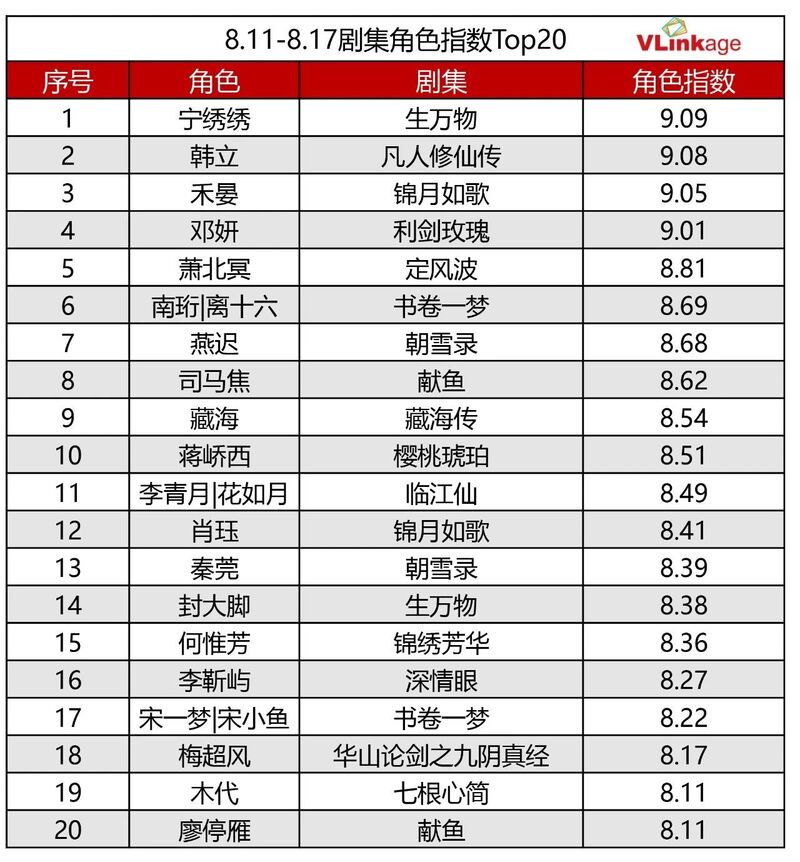下图为上周剧集角色指数Top20,《生万物》女主宁绣绣,《凡人修仙传》男主韩立,《锦月如歌》女主禾晏,以及《利剑玫瑰》女主邓妍,都是上周在剧迷中广受欢迎的角色。这些来自高网播指数剧集的角色,原本就有广泛的受众认知度,加上主演本人的号召力,都是角色热度居高不下的原因。