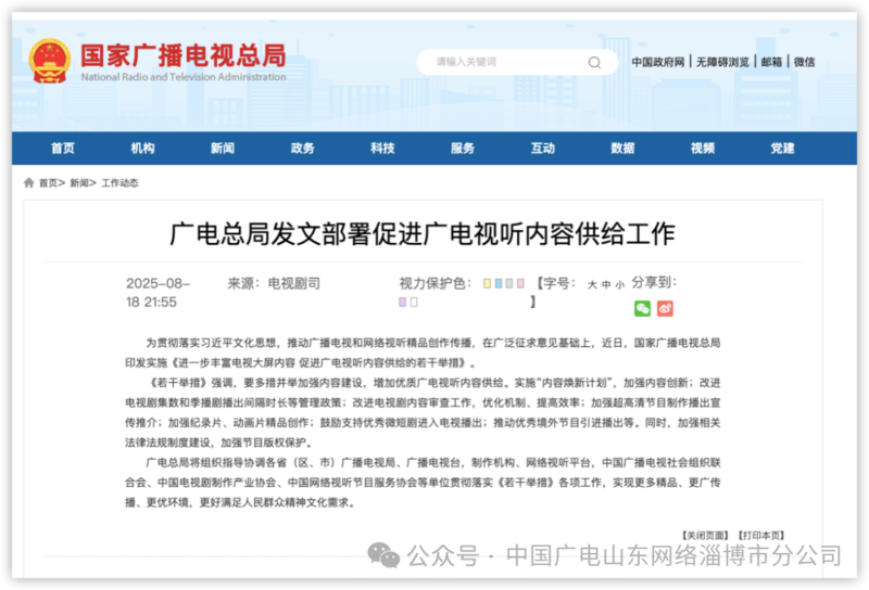 广电总局将组织指导协调各省(区、市)广播电视局、广播电视台,制作机构、网络视听平台,中国广播电视社会组织联合会、中国电视剧制作产业协会、中国网络视听节目服务协会等单位贯彻落实《若干举措》各项工作,实现更多精品、更广传播、更优环境,更好满足人民群众精神文化需求。