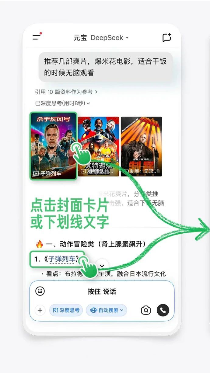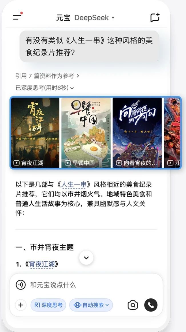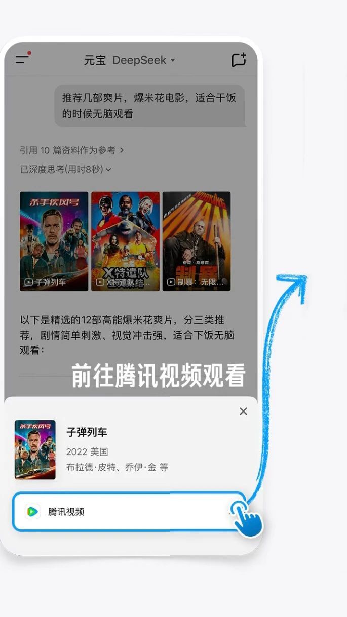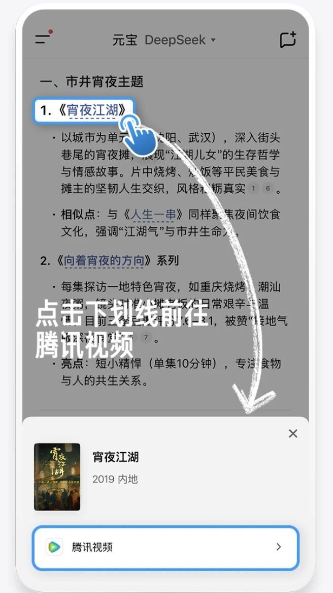 在满足基础的观看需求之外,腾讯元宝还为用户提供了更深入的“聊剧情”互动体验。观众在观看内容的同时,如果想进一步了解作品的创作背景、剧情内涵、风格流派等信息,都可以直接与元宝展开对话。通过智能解析和延展推荐,用户不仅能够获取更全面的影视解读,还能在交流过程中发现更多相关作品,并可一键跳转至腾讯视频观看。这种“边聊边看”的沉浸式体验,让观看长视频内容不再局限于单纯的娱乐消遣,而是延伸为一种更具深度与互动性的文化享受。