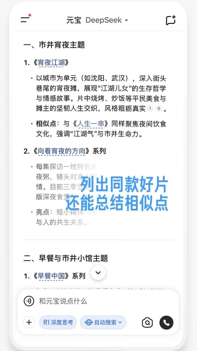 在解决“剧荒”方面,腾讯元宝同样展现了强大的智能推荐能力。用户只需输入简单需求,例如“推荐一部适合全家观看的喜剧”,或是将感兴趣的某个角色或演员告诉元宝,就能立即生成个性化片单,精准匹配观影场景。更值得一提的是,元宝具备识别角色和演员的能力,能够根据用户提及的角色形象,延伸出该演员的其他参演作品推荐。通过这样的智能化服务,用户不仅能快速找到符合心意的内容,还能在熟悉的角色与演员之间,开启更多观看惊喜。
