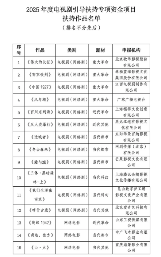 近期,国家广播电视总局公布2025年度电视剧引导扶持专项资金项目评审结果,《伟大的长征》《南京谈判》等12部电视剧(网络剧)和《战邮 1942》等3部网络电影入选。整体而言,这些作品呈现出四方面共性:重引导而非迎合、贴地气而不浮躁、重故事而不说教、重创新而不扎堆。