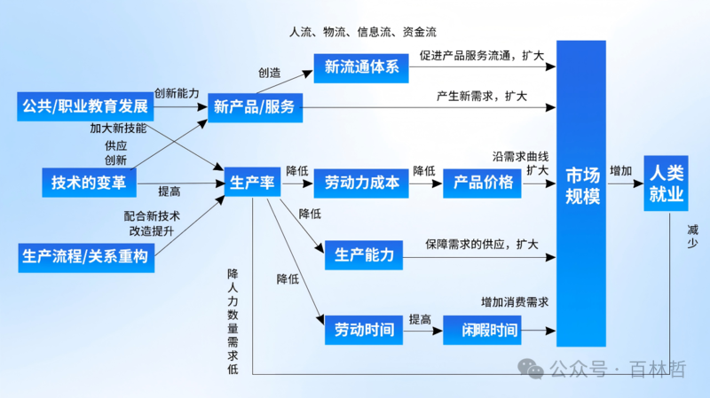 无论是在手工时代,还是工业革命时期,新的技术突破,也会带来全新的产品和服务。19世纪30年代修建的蒸汽机车和铁路;20世纪10年代的汽车和公路建设;21世纪10年代的智能手机和移动互联网服务,都是巨大的新市场和蛋糕。重要的是,新的产品同样会促进其他行业产品的流通。新岗位的就业数量与市场规模成正比,新技术要打开新市场,才能源源不断的增加岗位,来解决旧岗位被技术替代解决的失业问题。工业革命是在1840年后进入的良性循环,1850年工厂发挥规模经济优势,刺激蒸汽机的应用,催生密集型的新岗位。新技术的使能效应过程中,呈现了两个关键特征,分别是生产体系和人力教育对技术的主动适应性。