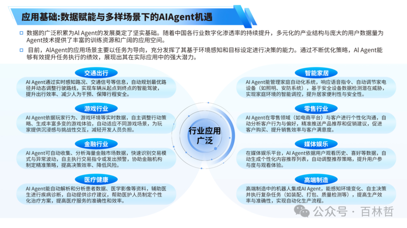 如今,Agent已衍生出多样化的类型,诸如能够跨越不同领域进行交互的通用型Agent、专注于物理环境操作执行的具象化Agent,以及擅长动态内容创作的生成式Agent等,它们广泛渗透至医疗健康、智能机器人、电子游戏等诸多行业领域。以医疗为例,诊断类Agent能有效辅助分诊流程,然而仍需攻克“幻觉”这一技术难题;而在游戏世界中,Agent不仅能优化非玩家角色(NPC)的行为逻辑,还能自动生成栩栩如生的开放世界景观,极大地丰富了游戏体验。