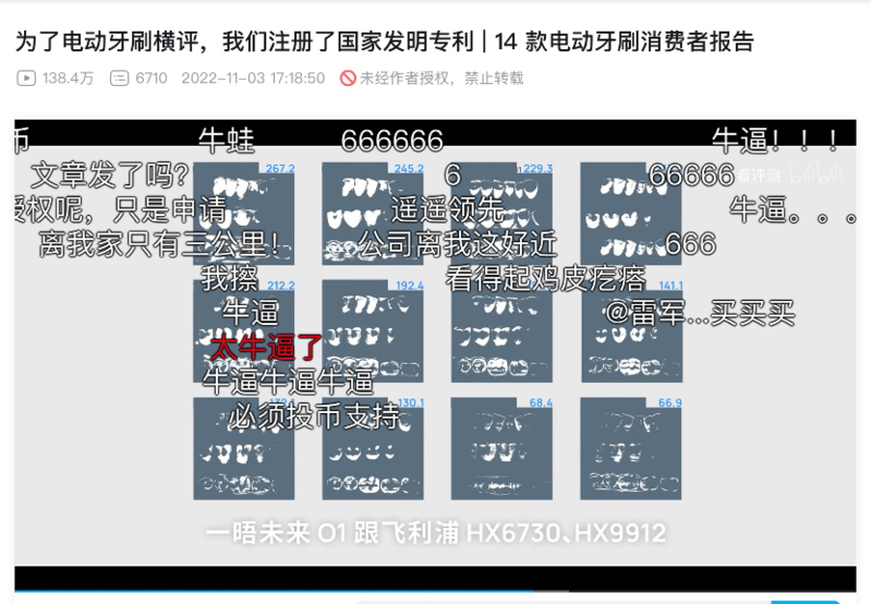 在一期评测电动牙刷的视频中,B站UP主“先看评测”不仅从构造、摆动幅度等常规角度拆解电动牙刷的运转逻辑,还通过真人实验进一步量化牙刷的清洁力,团队甚至研发出一款牙齿专利模型进行测评。评论区不少用户大篇幅地分享出基于自身体验的“用户报告”,也有更多人基于测评内容完成了消费决策的最后一步。