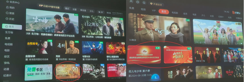 9月3日银河奇异果(左)的“山河见证”专区推荐位以及9月4日芒果TV(右)上新