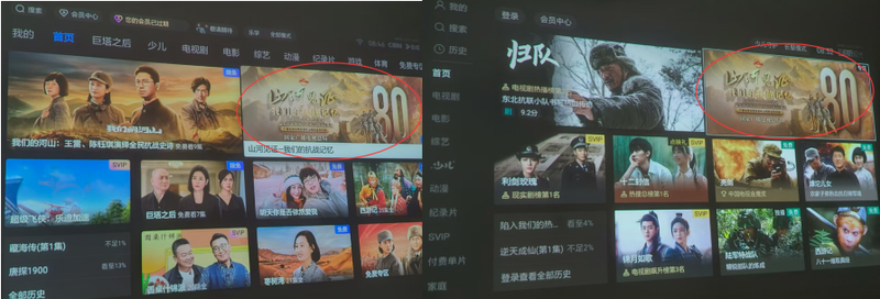 9月3日CIBN酷喵(左)和云视听极光(右)的“山河见证”专区推荐位变大了,此前是在下边的小幅海报区域