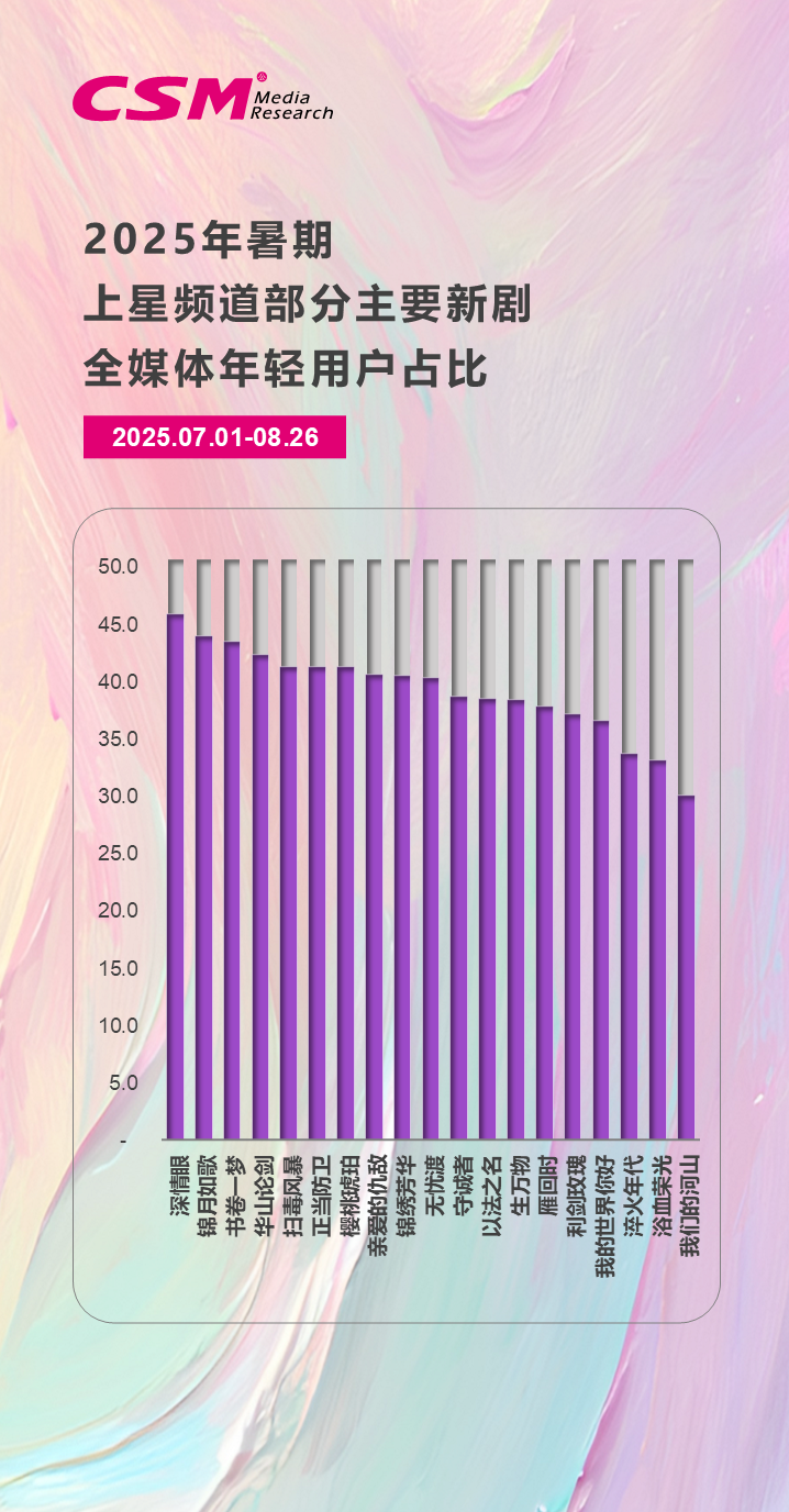 暑期剧“含青量”整体如何?CSM全媒体数据(NewTAM)显示,首轮新剧中15-44岁青年观众占比均值达39%,逾半数剧目突破40%。其中,《深情眼》青年用户占比高达46%,《锦月如歌》《书卷一梦》紧随其后,占比均达44%;《华山论剑》《扫毒风暴》《樱桃琥珀》《锦绣芳华》《无忧渡》等作品的青年用户占比亦悉数超过40%。
