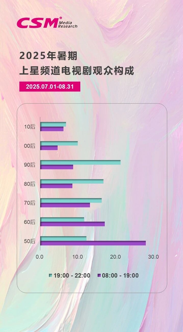 今年暑期档电视剧市场,白天时段依旧由“银发族”稳坐收视大盘;然而一旦夜幕降临,晚黄档却悄然完成“权力交接”——“含青量”(青年群体占比)陡然飙升:“90后”异军突起,占比从日间的不足9%跃升至21%以上,一举成为收视新主力;“80后”紧随其后,占比逼近17%,较百日提升超过8个百分点,成为重要支撑力量;“70后”小幅加码,增加3个百分点,占比突破16%;“00后”与“10后”亦顺势上扬,进一步壮大了年轻收视阵营。与之形成反差的是,”60后”与“50后”大幅退潮,“50后”降幅尤为突出,跌幅超过15个百分点。