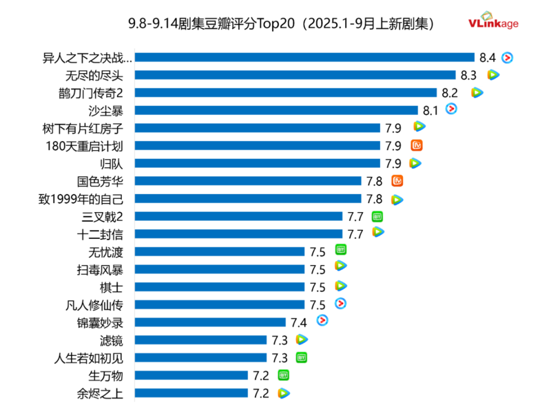 下图为上周剧集豆瓣评分Top20,上周有2部作品豆瓣开分进入榜单,分别为7.9分的《归队》和7.7分的《十二封信》。难得的是,《归队》不仅口碑表现不俗,其热度也在80+量级,是今年为数不多叫好又叫座的佳作。而高概念设定的情感剧《十二封信》虽然热度没能出圈,但剧迷满意度极高。