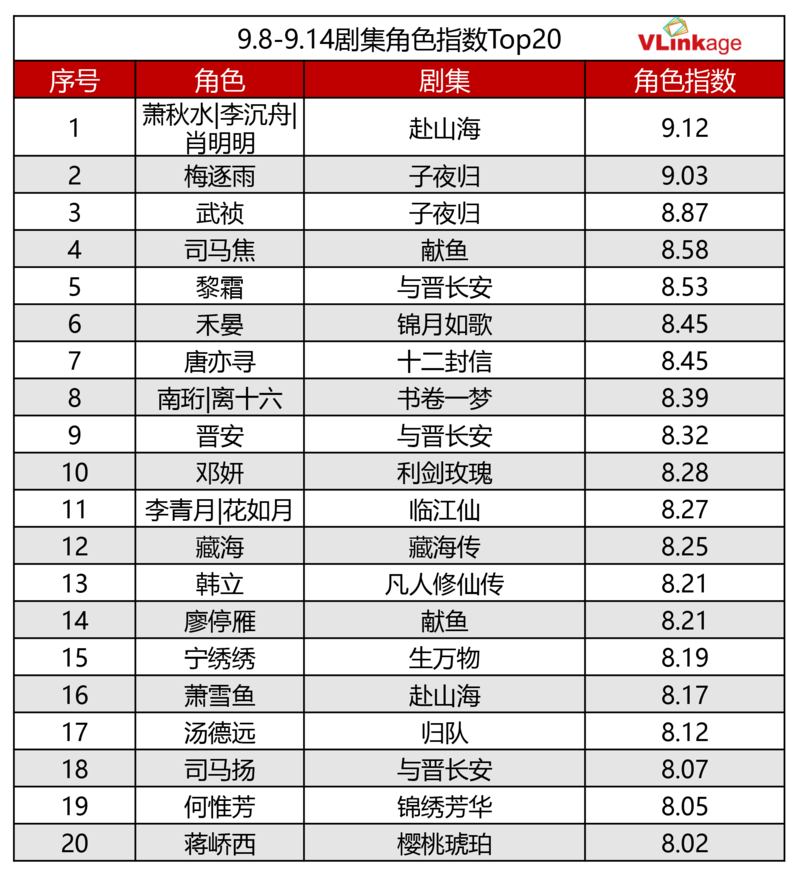 下图为上周剧集角色指数Top20,受众关注度最高的角色是《赴山海》男主萧秋水,作品的优异热度表现,角色的高辨识度,以及主演的受众号召力,都是角色开播后迅速出圈的原因。