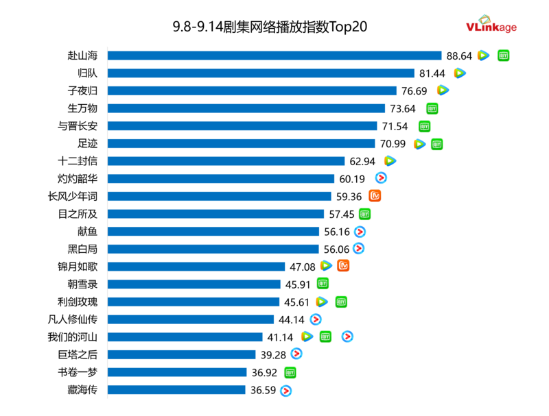 下图为上周剧集网播指数Top20,热度最高的作品为上周新剧《赴山海》,首周网播指数便高达88.64,撑起了上周的大盘热度。主旋律剧《归队》在正向口碑发酵下,热度持续攀升,上周网播指数保持在80+量级。