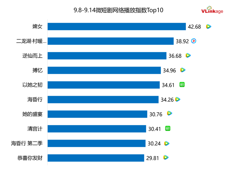 下图为上周微短剧网播指数Top10,热度最高的作品为新剧《婢女》,该剧也是上周唯一一部热度在40+的微短剧。