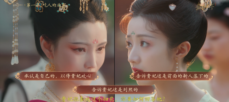 推开宫门后,我跟其他才人在尚宫的带领下来到一处宫殿前等候。这时,我身后的一个女孩拉拉我的衣袖,与我攀谈起来。这个女孩原来是我之前的旧相识,只因多年未见有些生疏。她拿出一枚精致的牡丹簪子像要赠予我,礼让之间,簪子掉落,后宫赫赫有名的韦贵妃出现。韦贵妃问这支掉落的簪子是谁的,并点了我起来回答这个问题。