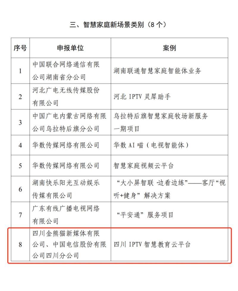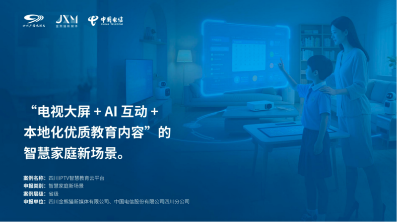 由四川金熊猫新媒体有限公司、中国电信股份有限公司联合申报的“四川IPTV智慧教育云平台”,从全国197个推选案例中脱颖而出,荣获2025年“全国智慧广电网络新服务”智慧家庭新场景类别8个入选案例之一。