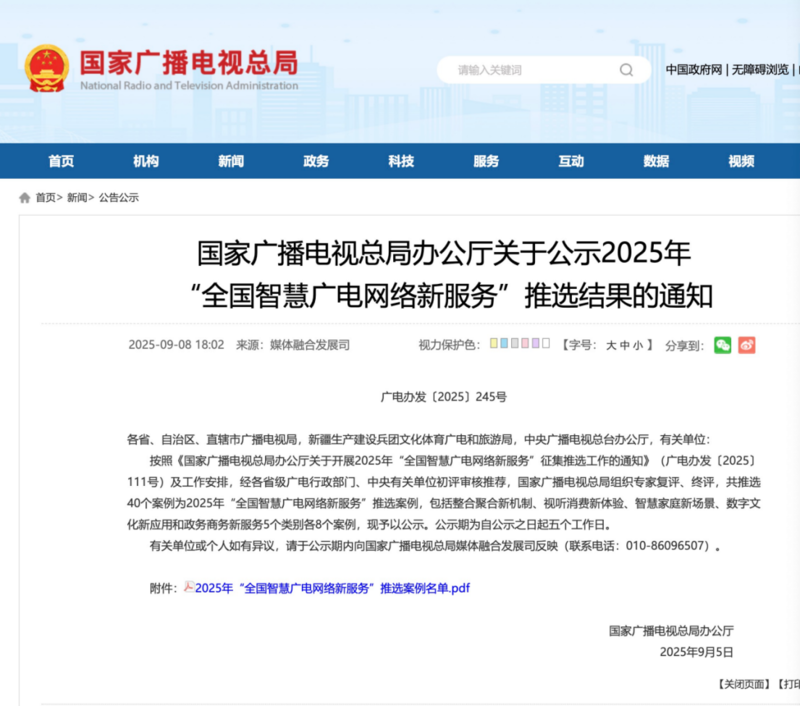 日前,国家广播电视总局公布2025年“全国智慧广电网络新服务”推选结果。