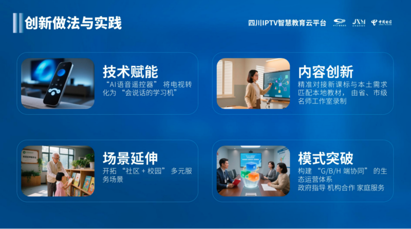 “四川IPTV智慧教育云平台”以“智媒体+教育”的融合创新模式为引领,打造了集“公益普惠+增值服务、大小屏互动+线上线下联动”为一体的立体化用户服务体系,开创了“技术赋能教育、内容服务家庭”的智慧广电新范式。