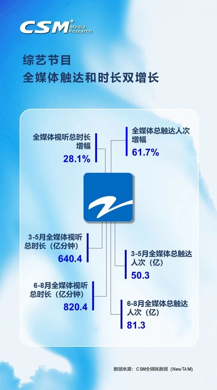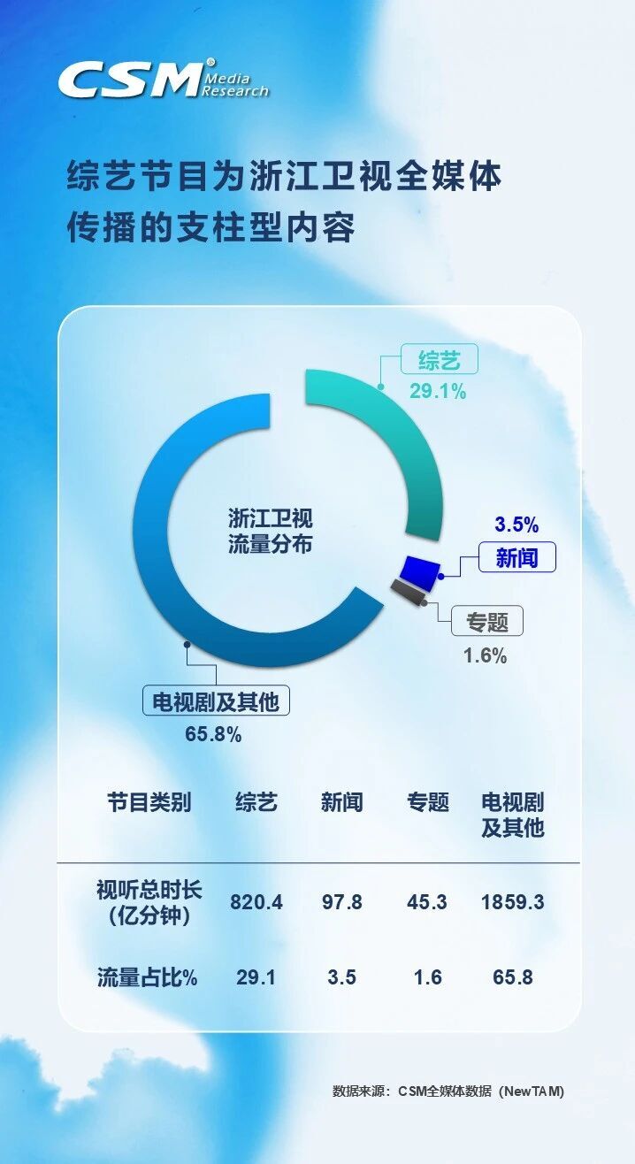 CSM全媒体数据(NewTAM)显示,浙江卫视2025年6-8月综艺节目传播表现突出,节目全媒体总触达为81.3亿人次,较前三月大幅增加31亿人次,增幅达61.7%;6-8月综艺节目全媒体视听总时长达820.4亿分钟,较3-5月增长180亿分钟,增幅28.1%。从频道节目类型流量贡献来看:除了电视剧等节目外,综艺节目贡献了29.1%的频道流量,《奔跑吧第九季》《闪光的夏天第二季》《天赐的声音6》等“综N代”节目发挥IP影响力,与多档新综共同发力,稳固综艺流量主阵地。
