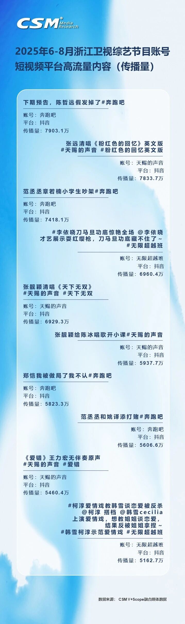 浙江卫视综艺节目账号短视频传播量TOP10内容全部来自抖音平台,多档王牌节目凭借一系列“高光名场面”持续引爆社交传播。其中,《奔跑吧》贡献出“陈哲远假发掉了”这一爆笑名场面,单条视频狂揽近8000万传播量,成为今夏出圈名场面之一;《天赐的声音》则延续“神仙舞台”口碑,张远清唱《粉红色的回忆》英文版魔性改编获7833.7万传播量,张靓颖清唱《天下无双》再现天籁之音,也获得超6929.3万传播量,真正实现“开口即封神”,彰显音综的品质影响力。