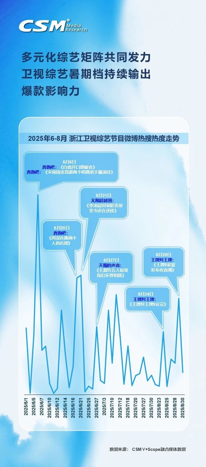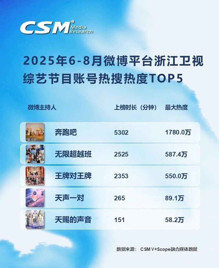 浙江卫视标杆IP综艺,《奔跑吧》2025年6-8月微博热搜上榜时长超5300分钟,累计最大热度达1780万,《无限超越班》《王牌对王牌》微博热搜上榜时长均超2300分钟,累计最大热度均超550万。