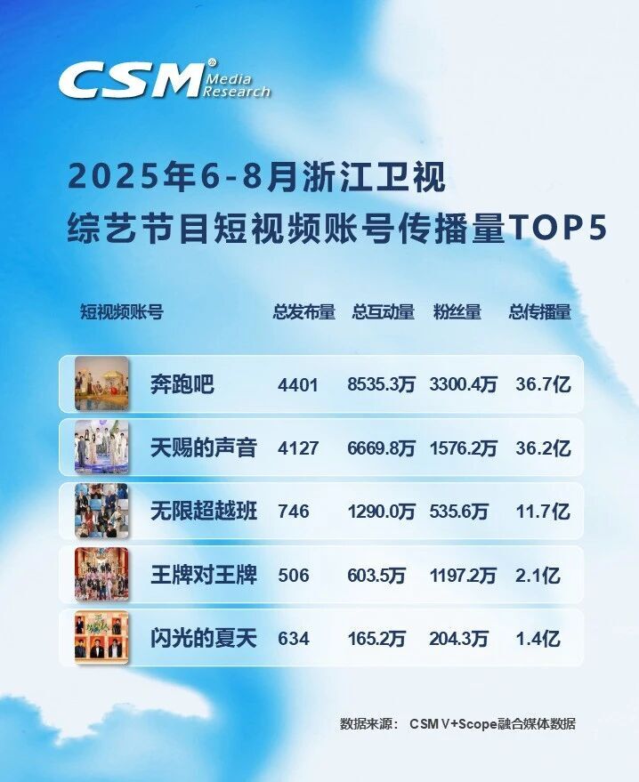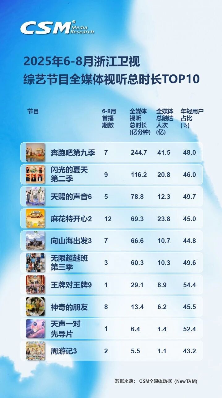 2025年,是浙江广电集团"改革创新年"。浙江卫视(中国蓝新平台)着力提升内容创新、传播破圈能力,以"新质综艺行动"拓展、夯实"综艺IP基建" 传播基础。在刚刚过去的夏季,浙江卫视为观众带来精彩纷呈的综艺盛宴,既有《奔跑吧第九季》《王牌对王牌9》《天赐的声音6》《无限超越班无负成长季》《闪光的夏天第二季》等经典王牌节目焕新回归,也有《神奇的朋友》《天声一对》等多档新综艺亮相,本文使用CSM全媒体数据(NewTAM)和CSM V+Scope融合媒体数据,对6-8月浙江卫视主要综艺节目的全媒体传播表现进行简要梳理,为综N代IP“续航力”、传播“破圈力”等话题的探究提供数据角度的参考。