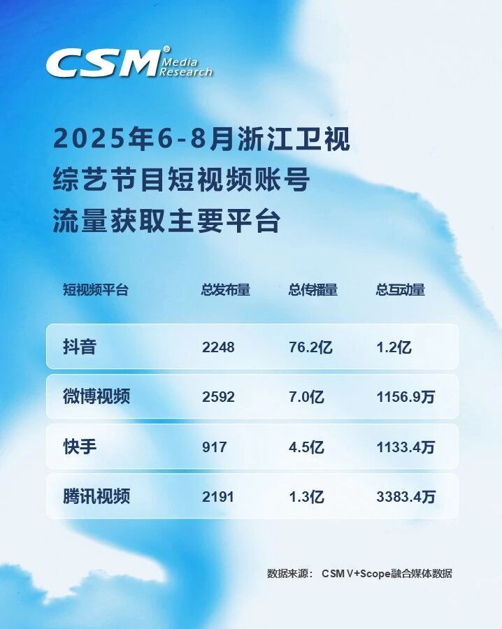 浙江卫视各档综艺节目短视频账号多平台布局,抖音、微博视频和腾讯视频平台高频发布,6-8月发布量均超2000条。其中,抖音平台以76.2亿传播量和1.2亿互动量成为传播流量主阵地,其余几大主要短视频平台传播量也均达亿级。
