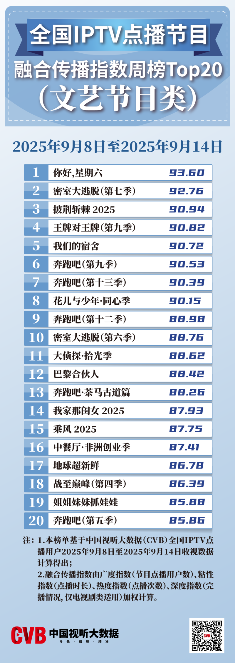 全国IPTV点播节目融合传播指数周榜Top20(文艺节目类)【9.8-9.14】
