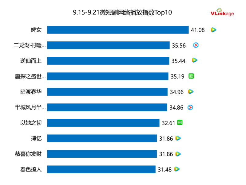 下图为上周微短剧网播指数Top10,热度最高的作品为《婢女》,该剧也是上周唯一一部网播指数破40的作品。