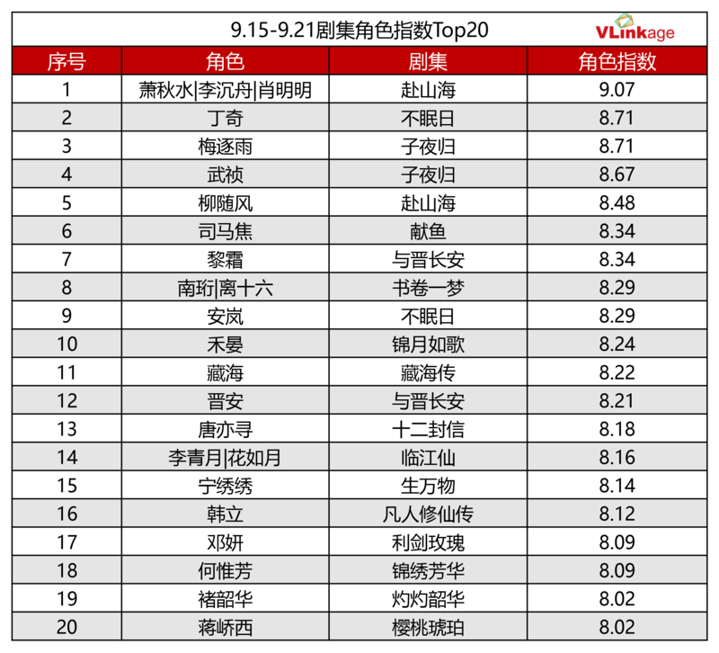 下图为上周剧集角色指数Top20,受众认知度最高的角色为《赴山海》男主萧秋水,作品的高热度和演员的受众号召力,都是角色出圈的基础。