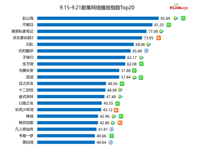 下图为上周剧集网播指数Top20,热度最高的作品为男频剧《赴山海》,网播指数达到85+。上周新剧《不眠日》首秀也很亮眼,网播指数在80+量级。
