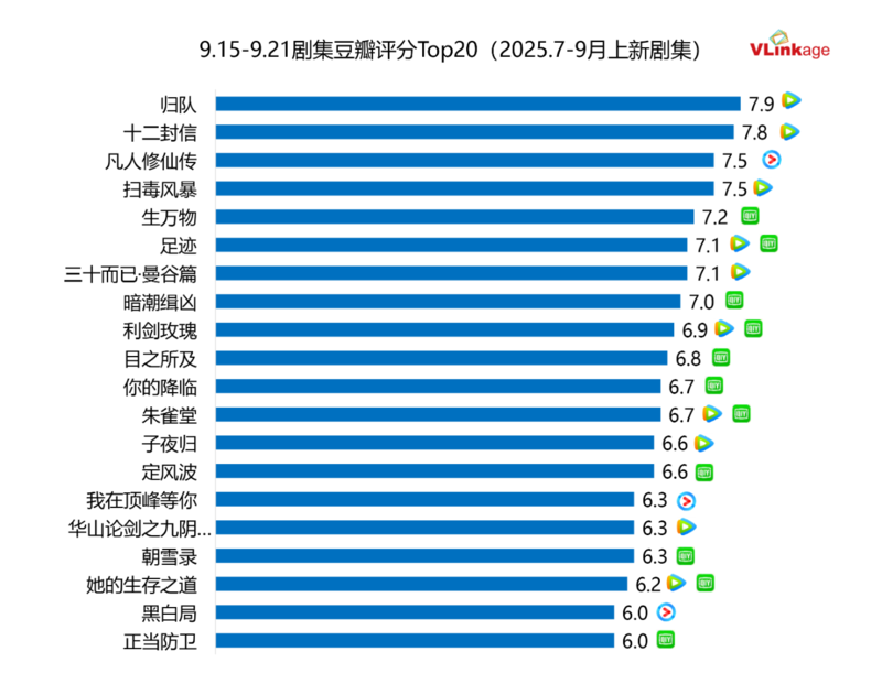 下图为今年7-9月剧集豆瓣评分Top20,今年下半年,有8部作品豆瓣评分在7分以上,8分以上作品暂时还未出现。其中,口碑最佳的作品为7.9分的抗战剧《归队》,和7.8分的悬疑爱情剧《十二封信》。