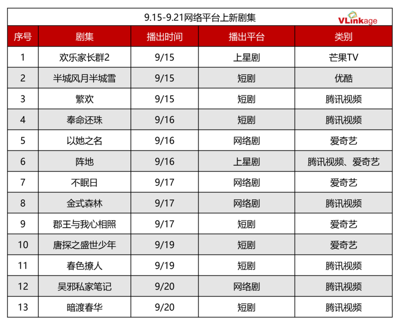 上周,各大平台共有13部新剧上线。其中上星剧2部,网剧4部,微短剧7部。在这些剧集里,都市家庭剧《欢乐家长群2》因前作的高国民度而备受期待,高概念悬疑剧《不眠日》也因新颖的设定而备受关注。同样有着观众基础的还有探险剧《吴邪私家笔记》,IP的高认知度,在前期为作品带来一定关注度。