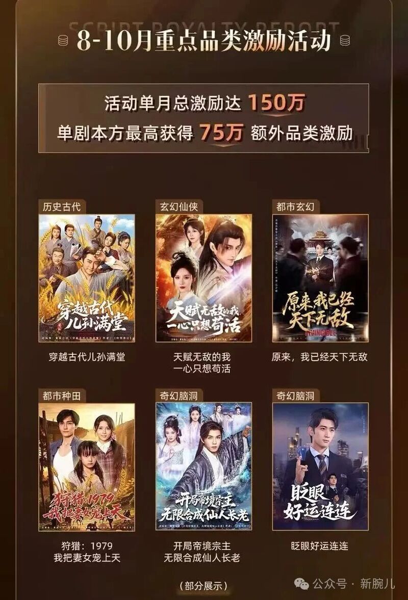 在8-10月份重点品类激励活动下,单月总激励达150万,单剧本方最高获得75万额外品类激励,包括《穿越古代儿孙满堂》、《天赋无敌的我,一心只想苟活》、《原来,我已经天下无敌》等,几部展示的剧目均为男频。