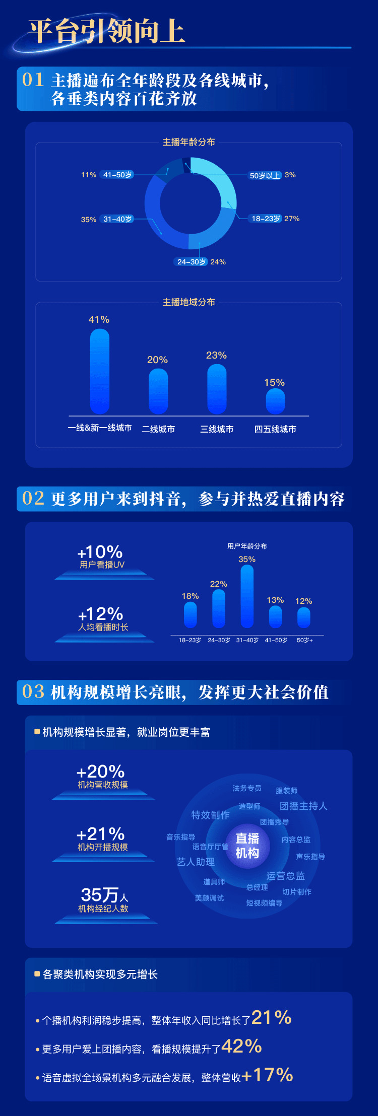 此外,更多专业力量陆续加入,优质专业的内容正成为直播行业的核心竞争力。今年,超20家娱乐经纪公司来到抖音平台,为直播行业带来更精致的专业舞台内容,进一步提升了直播内容丰富度和专业度。