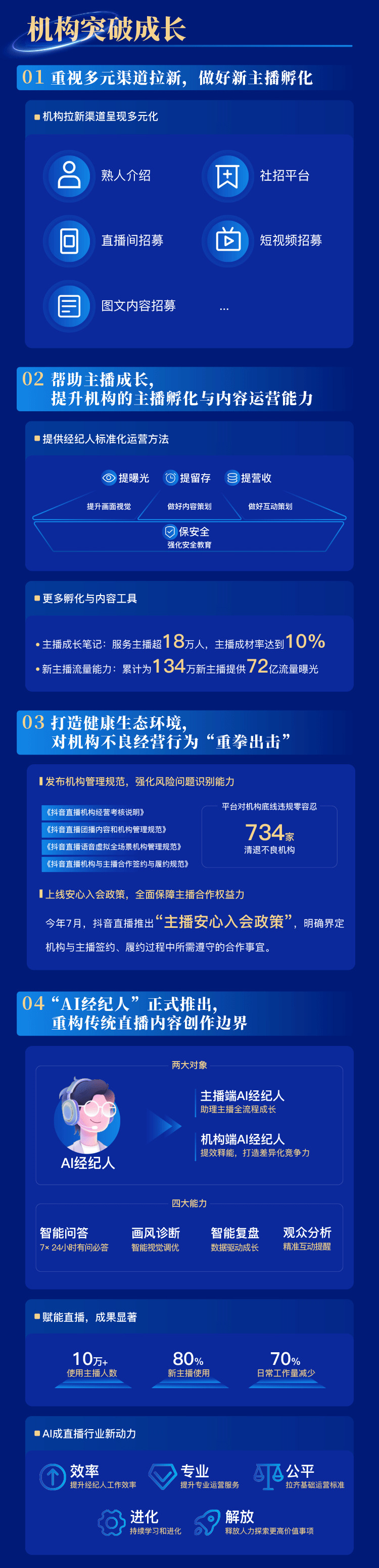 今年7月,抖音平台还推出“主播安心入会政策”,针对机构与主播签约、履约过程中所需遵守的合作事宜进行明确界定。对于存在协议欺诈、不如实履约等违规行为的机构,平台将追究其主体责任。2025年,抖音平台协助3047名主播与存在协议欺诈等问题的机构解除合作,并且针对79家机构的不规范合约问题进行处置和整改。