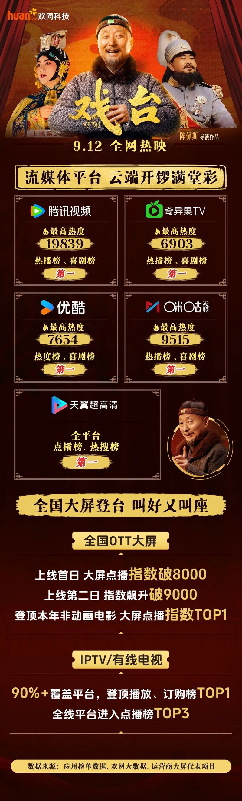 不过,在9月12日,随着《戏台》在全网上线,其命运也出现了转折——影片迅速在流媒体、家庭大屏等渠道实现二次爆发,叫好又叫座。