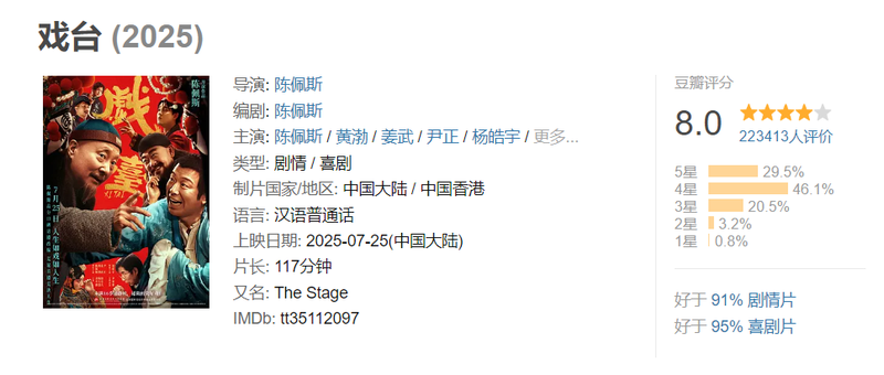 《戏台》改编自同名话剧,融合了传统戏曲元素与现代叙事,目前在豆瓣已有22多万人打出了8.0的高分,堪称口碑佳作。