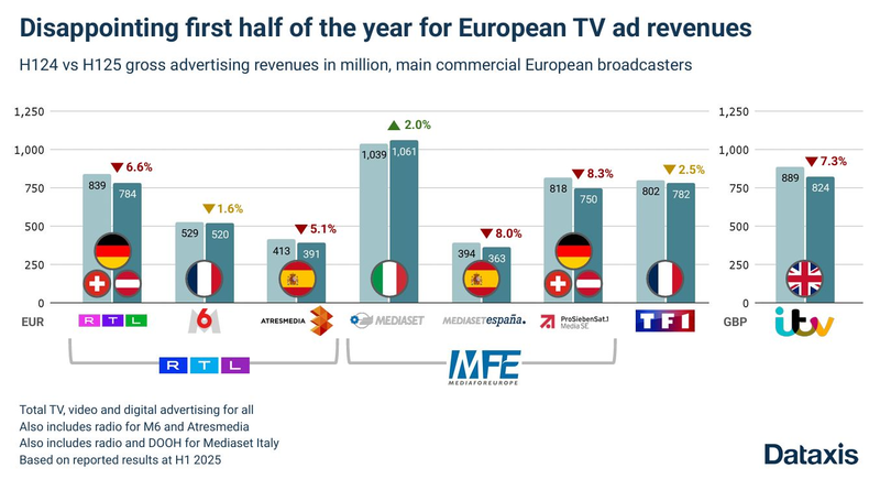 欧洲最大的电视广播集团发布了 2025 年 H1 财报。就前五大市场的广告收入展望而言,线性端形势偏弱,尽管数字端出现了积极信号。