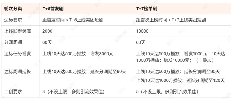 【发行及收益分成】: 共创短剧首发免费模式上线美团14天站内5000万-1亿+流量扶持,独播期广告分润收入承[+制方获100%收益,外放后转免费模式活动持续分润;美团平台外渠发行链路的变现收益双方按成本支出比例进行分成,双方均持有发行上线权;