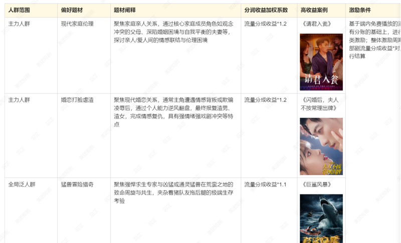 喜爱品类:美团的短剧用户中,下沉市场中青年+中老年人群深度消费行为显著且女性居多,集中偏好现代婚姻、家庭伦理、大女主打脸虐渣等题材;而全局泛热度较高的题材下探集中在猛兽冒险猎奇、都市逆袭爽文等爽点密集节奏跌宕的题材品类,拟以两个月为激励周期,开展高喜爱品类专题激励,若同时是首发!榜单且符合喜爱品类,可向平台申请流量资源位;(平台审核对应品类通过的短剧即可在5.0活动中获得分润收益系数加成)