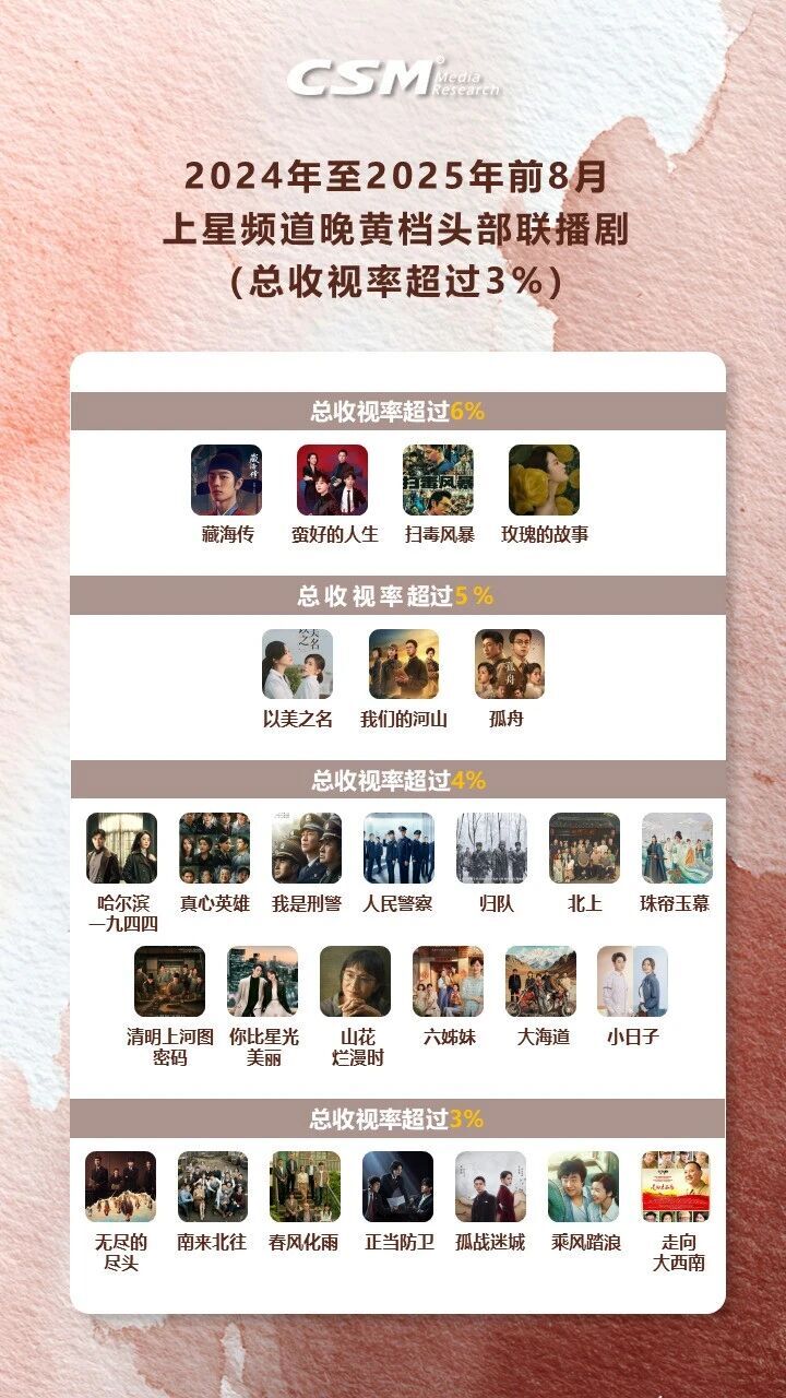 联播剧不仅能加持剧集从"收视高原"向"收视高峰"跨越,更能轻松抵达大多独播剧难以企及的"收视顶峰"。2024年至2025年8月,在71城市,上星频道晚黄档独播剧最高收视率为3.21%,而超过该数值的联播剧达22部。其中,《藏海传》《蛮好的人生》《扫毒风暴》《玫瑰的故事》4部剧总收视率超6%,《以美之名》《我们的河山》《孤舟》总收视率超5%;另有《哈尔滨一九四四》《我是刑警》《归队》《北上》《六姊妹》等11部剧总收视率突破4%,均以联播模式实现高收视突破。