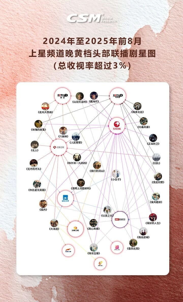 联播剧具备成本共担、收视聚合的核心优势,不仅能有效摊薄购剧与宣发成本,更易通过多平台协同形成收视共振效应,进而催生年度现象级作品。CSM统计,2024年至2025年8月期间,上星频道晚黄档开播的首轮剧中共有30部在71城市的总收视率突破3%,其中独播剧仅占3部,两星联播、三星联播分别占12部与13部,四星、五星联播各占1部;而总收视率超4%的剧集,则全部为联播剧,显示联播模式在高收视区间的绝对优势。