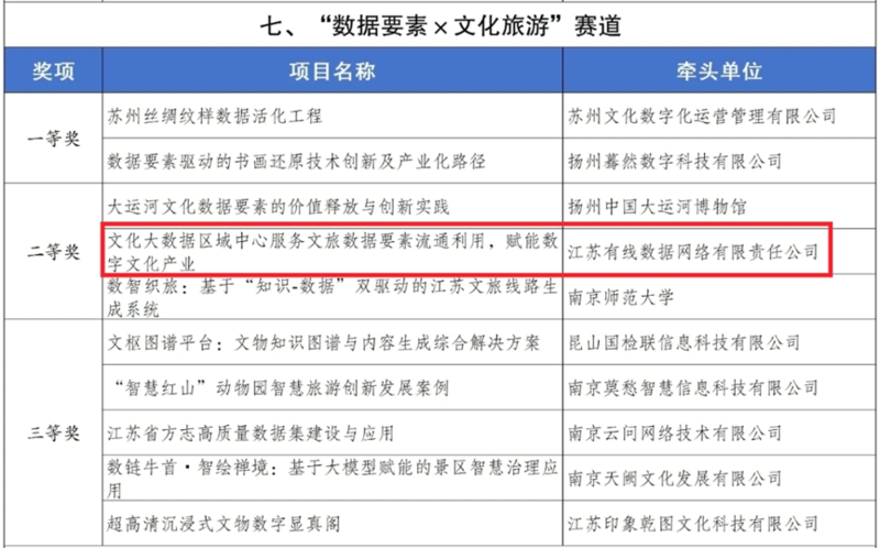 在2025年“数据要素×”大赛江苏分赛中,来自省内外企事业单位、科研院所、高等院校的1299支队伍报名参赛,参与14个行业赛道的赛事角逐。最终,数据公司申报的“文化大数据区域中心服务文旅数据要素流通利用,赋能数字文化产业”项目,在文化旅游赛道23支决赛队伍中斩获二等奖。该项目锚定江苏有线“文化+科技”融合战略,结合文化数据多源性、多模态、多维度、多场景的特性,以文化数据资源的开发利用为基础,聚焦文化资源数字化、文化数据资源应用场景、智慧旅游创新等方向,全面梳理业务全链路的数据要素应用实践。此外,公司申报的另一项《基于多源数据要素融合治理的地震数据资源池建设及防震减灾公共服务实践》项目,也成功入围应急赛道决赛。