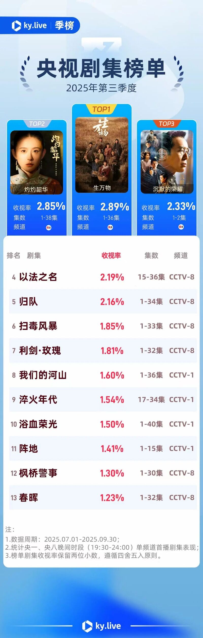 进入7-9月暑期档,央8延续了上半年的强劲收视势头,多部剧集凭借题材创新与制作水准斩获高收视。现实题材剧《生万物》以2.89%的收视率成为本季度最大黑马,位列Q3收视冠军;紧随其后的是近期完结的《灼灼韶华》,收视率达2.85%,位居第二;仍在更新中的谍战剧《沉默的荣耀》则以2.33%的收视率稳居第三名。